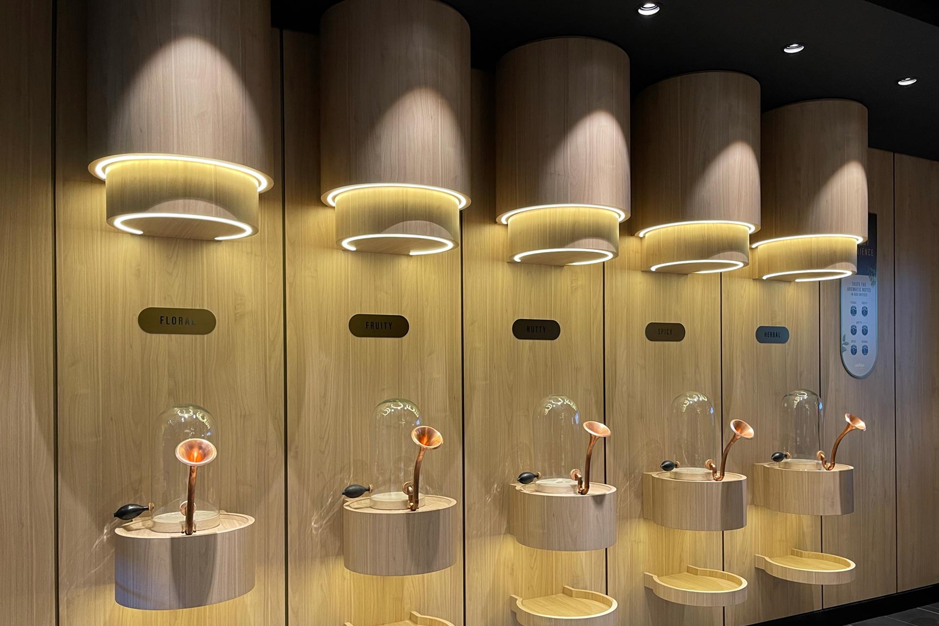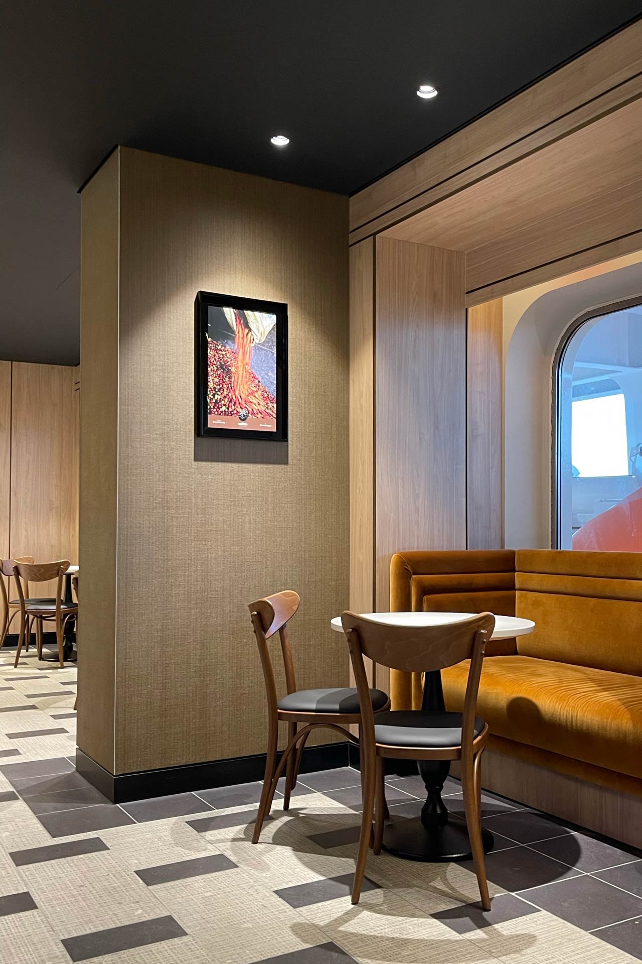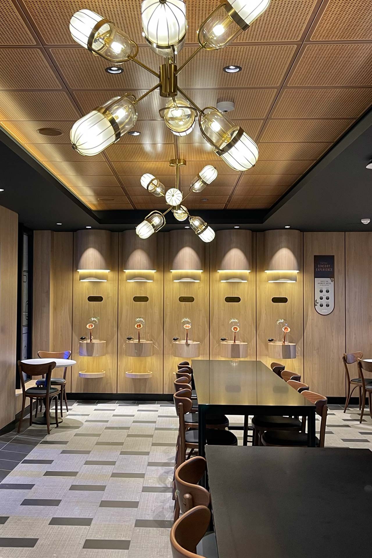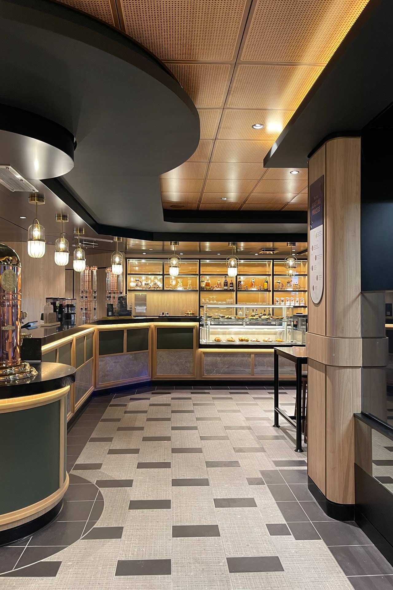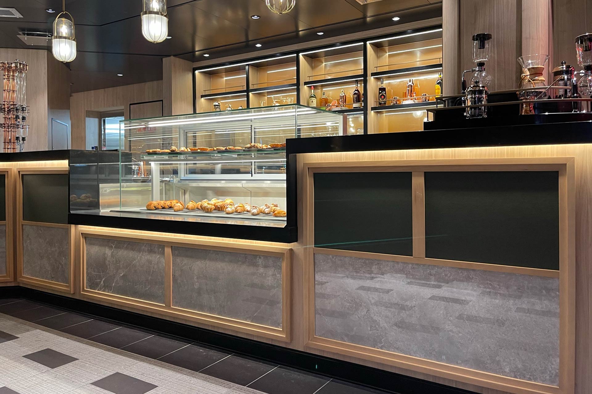 Emporium Coffee, on board MSC World Europa, was conceived as a contemporary and welcoming café, integrated into the ship’s leisure and dining offering. The space is organised between the service counter, seating area, and supporting technical areas. PPS was responsible for the full construction of the space and for overseeing the production of all joinery elements.